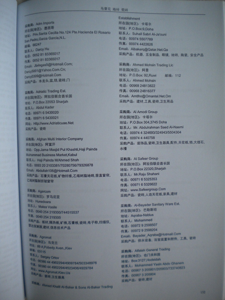 書刊簡介:《全球采商黃頁》系列叢書是由全球最活躍的專業(yè)買家及重要國際性展會的到會采購商名片信息匯編而成,包含三十多個行業(yè)分類,匯集了各類產(chǎn)品的買家信息。其中收錄的每家采購商信息均是我們通過與買家面對面的登記整理收集而成,采購意向明確,針對性強。為了確保信息的準確性和時效性,我們定期進行跟進、回訪、補充及更新工作。每家采購商信息包括國別、公司名稱、聯(lián)系人、地址、電話、傳真、電郵、網(wǎng)址、采購產(chǎn)品等詳細內(nèi)容,每冊《黃頁》約有兩千家左右的采購商信息。在當前國際出口形勢日趨嚴峻的環(huán)境下,如何降低成本開拓國際市場,是每個出口企業(yè)急需尋找的答案,我們相信通過我們10多年的外貿(mào)信息服務(wù)經(jīng)驗和最新的國際買家資源服務(wù),將會為您拓展全球市場提供最直接有效的幫助。專業(yè)對口的買家信息一定會幫助貴公司打開更廣闊的外貿(mào)市場!