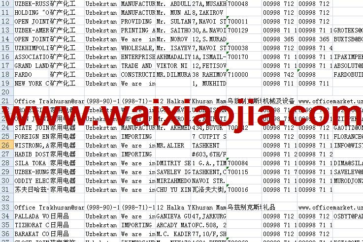 烏茲別克斯坦采購商名單數(shù)據(jù)為Excel格式,信息可任意修改、復(fù)制、打印、導(dǎo)出及導(dǎo)入到傳真、郵件群發(fā)等軟件中,無任何限制。