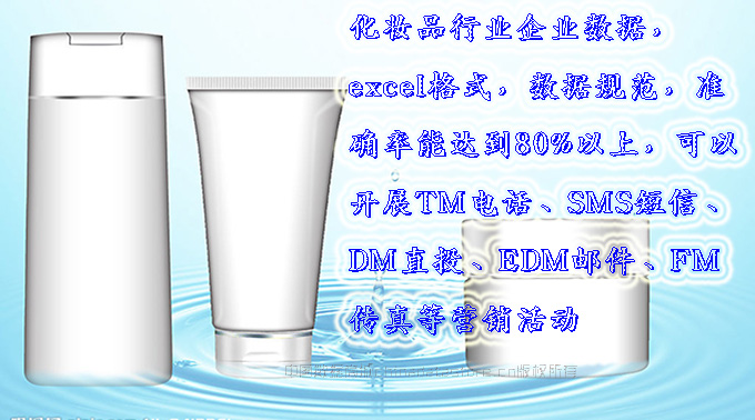 最新化妝品生產(chǎn)與貿(mào)易企業(yè)黃頁(yè)數(shù)據(jù)更新日期2025年12月最新,全國(guó)化妝品企業(yè)黃頁(yè)共66000條,都是具有一定規(guī)模的化妝品行業(yè)的注冊(cè)實(shí)體企業(yè),數(shù)據(jù)準(zhǔn)確率高,是您開(kāi)展各項(xiàng)營(yíng)銷活動(dòng)的必備資料。企業(yè)名單包括:企業(yè)名稱、地址、電話(以上必有,以下選有)、傳真、郵箱、登記日期、經(jīng)營(yíng)范圍、注冊(cè)資金等信息?;瘖y品企業(yè)黃頁(yè)數(shù)據(jù)為Excel格式,信息可任意修改、復(fù)制、打印、導(dǎo)出及導(dǎo)入到傳真、郵件群發(fā)等軟件中,無(wú)任何限制。
