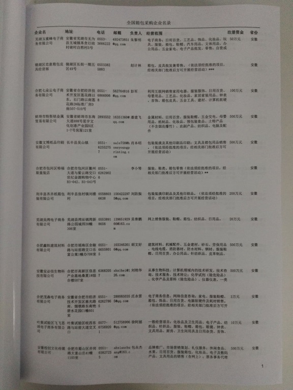 2025年新版中國箱包采購企業(yè)黃頁,收錄了全國各地經(jīng)營范圍涉及箱包產(chǎn)品的貿(mào)易企業(yè),這些都是頗具實(shí)力的箱包產(chǎn)品的中國采購商。黃頁內(nèi)容包含:企業(yè)名稱、地址、電話、傳真、郵箱、經(jīng)營范圍、省份、注冊資金等信息。該套黃頁包含一個(gè)黃頁光碟加一冊紙質(zhì)書刊,全國價(jià)格:1500元,省/直轄市價(jià)格:400元,城市價(jià)格:200元,共收錄了全國各地大概2542(統(tǒng)計(jì)日期:2018.1)家箱包產(chǎn)品采購企業(yè)。黃頁光碟中是EXCEL格式,信息可任意修改、復(fù)制、打印、導(dǎo)出及導(dǎo)入到傳真、郵件群發(fā)等軟件中,無任何限制。