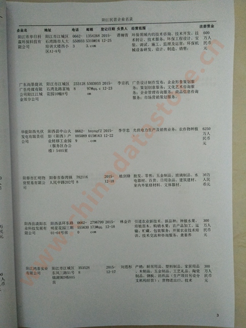 2021版最新陽(yáng)江企業(yè)黃頁(yè)包括《陽(yáng)江制造企業(yè)黃頁(yè)》、《陽(yáng)江民營(yíng)企業(yè)黃頁(yè)》,現(xiàn)優(yōu)惠價(jià):280元/冊(cè)。每?jī)?cè)內(nèi)容包括:?jiǎn)挝幻Q、地址、郵編、電話、傳真、郵箱、經(jīng)營(yíng)范圍等;陽(yáng)江企業(yè)黃頁(yè)涵蓋了近幾年來最新成立的、有一定規(guī)模的企業(yè),具有非常高的營(yíng)銷價(jià)值。有了這套黃頁(yè)開展業(yè)務(wù)也有了針對(duì)性,也省去了盲目去尋找客戶名單而浪費(fèi)的時(shí)間了,工作效率也會(huì)有很大的提高。歡迎需要陽(yáng)江企業(yè)黃頁(yè)的朋友及時(shí)聯(lián)系我們!