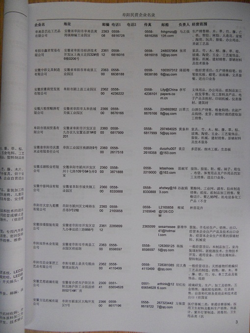 2021版最新阜陽企業(yè)黃頁包括《阜陽制造企業(yè)黃頁》、《阜陽民營企業(yè)黃頁》,現(xiàn)優(yōu)惠價(jià):280元/冊。每冊內(nèi)容包括:單位名稱、地址、郵編、電話、傳真、郵箱、經(jīng)營范圍等;阜陽企業(yè)黃頁涵蓋了近幾年來最新成立的、有一定規(guī)模的企業(yè),具有非常高的營銷價(jià)值。有了這套黃頁開展業(yè)務(wù)也有了針對(duì)性,也省去了盲目去尋找客戶名單而浪費(fèi)的時(shí)間了,工作效率也會(huì)有很大的提高。歡迎需要阜陽企業(yè)黃頁的朋友及時(shí)聯(lián)系我們!