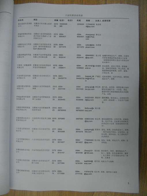 2021版最新六安企業(yè)黃頁包括《六安制造企業(yè)黃頁》、《六安民營企業(yè)黃頁》,現(xiàn)優(yōu)惠價:280元/冊。每冊內(nèi)容包括:單位名稱、地址、郵編、電話、傳真、郵箱、經(jīng)營范圍等;六安企業(yè)黃頁涵蓋了近幾年來最新成立的、有一定規(guī)模的企業(yè),具有非常高的營銷價值。有了這套黃頁開展業(yè)務(wù)也有了針對性,也省去了盲目去尋找客戶名單而浪費的時間了,工作效率也會有很大的提高。歡迎需要六安企業(yè)黃頁的朋友及時聯(lián)系我們!