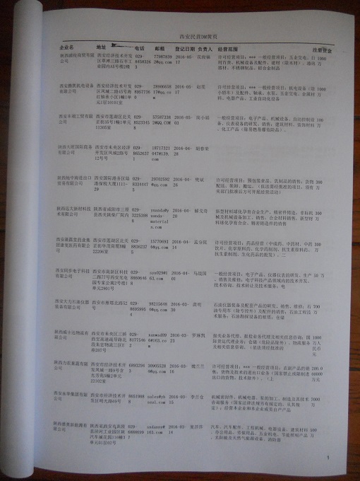 2021版最新西安企業(yè)黃頁(yè)包括《西安制造企業(yè)黃頁(yè)》、《西安民營(yíng)企業(yè)黃頁(yè)》,現(xiàn)優(yōu)惠價(jià):280元/冊(cè)。每?jī)?cè)內(nèi)容包括:?jiǎn)挝幻Q(chēng)、地址、郵編、電話(huà)、傳真、郵箱、經(jīng)營(yíng)范圍等;西安企業(yè)黃頁(yè)涵蓋了近幾年來(lái)最新成立的、有一定規(guī)模的企業(yè),具有非常高的營(yíng)銷(xiāo)價(jià)值。有了這套黃頁(yè)開(kāi)展業(yè)務(wù)也有了針對(duì)性,也省去了盲目去尋找客戶(hù)名單而浪費(fèi)的時(shí)間了,工作效率也會(huì)有很大的提高。歡迎需要西安企業(yè)黃頁(yè)的朋友及時(shí)聯(lián)系我們!