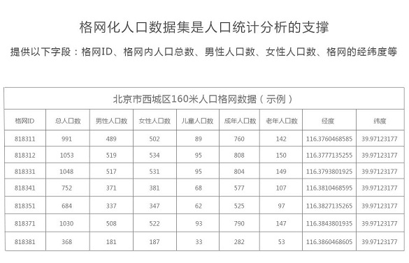 160米格網(wǎng)化人口統(tǒng)計,涉及36個數(shù)據(jù)統(tǒng)計項,可用于人口遷移分析、商圈選址等