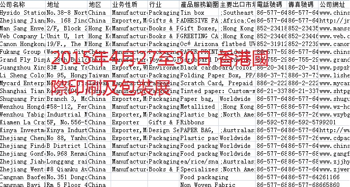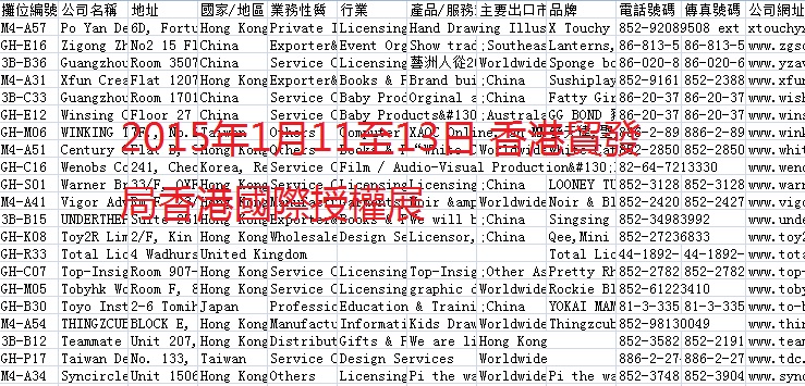 簡介:2015年香港貿(mào)發(fā)局展會會刊共收錄28個展會參展商信息。數(shù)據(jù)格式EXCEL,會刊內(nèi)容包含:公司名稱、地址、地區(qū)、業(yè)務性質(zhì)、行業(yè)、產(chǎn)品服務范圍、出口市場、電話、傳真、網(wǎng)址。