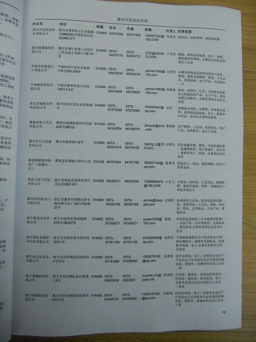 嘉興外貿(mào)企業(yè)黃頁包括:外貿(mào)企業(yè)名稱、地址、電話、傳真、郵箱、經(jīng)營范圍、注冊資金等信息。