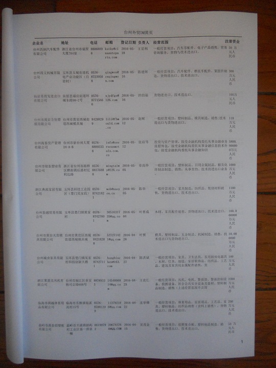臺(tái)州外貿(mào)企業(yè)黃頁包括:外貿(mào)企業(yè)名稱、地址、電話、傳真、郵箱、經(jīng)營范圍、注冊(cè)資金等信息。