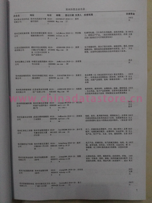 常州外貿(mào)企業(yè)黃頁(yè)包括:外貿(mào)企業(yè)名稱(chēng)、地址、電話(huà)、傳真、郵箱、經(jīng)營(yíng)范圍、注冊(cè)資金等信息。