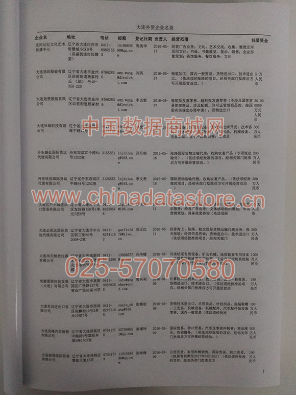 大連外貿(mào)企業(yè)黃頁包括:外貿(mào)企業(yè)名稱、地址、電話、傳真、郵箱、經(jīng)營范圍、注冊資金等信息。