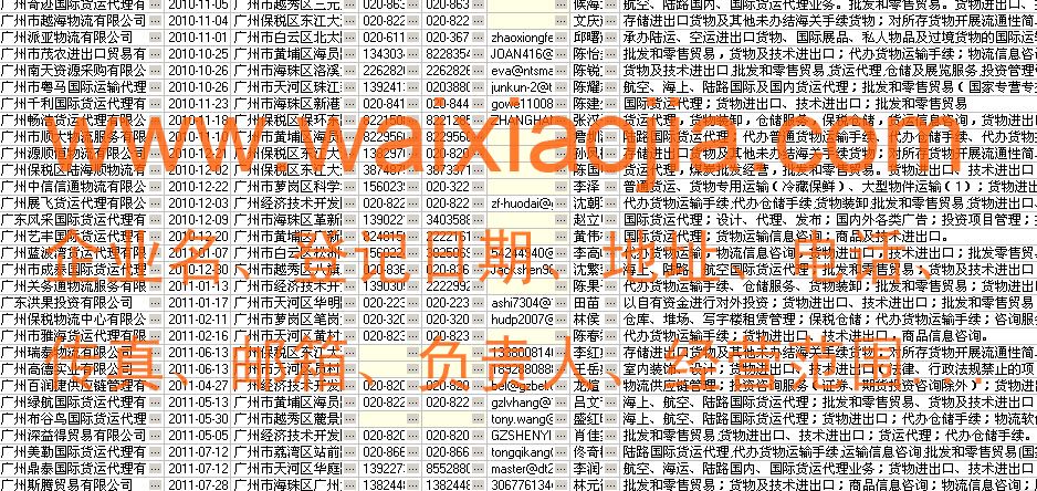 廣州貨運(yùn)代理公司名單數(shù)據(jù)為Excel格式,信息可任意修改、復(fù)制、打印、導(dǎo)出及導(dǎo)入到傳真、郵件群發(fā)等軟件中,無任何限制。