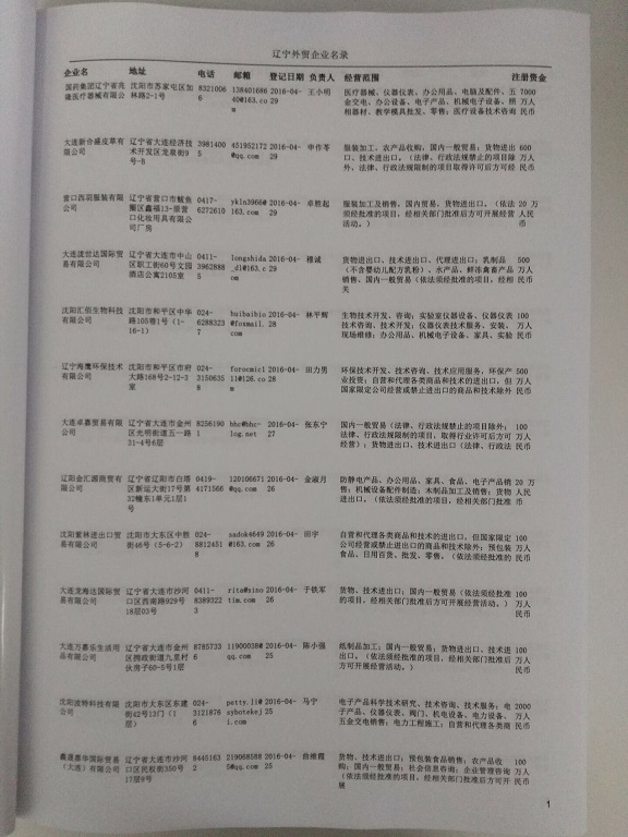 遼寧外貿企業(yè)黃頁包括:外貿企業(yè)名稱、地址、電話、傳真、郵箱、經(jīng)營范圍、注冊資金等信息。