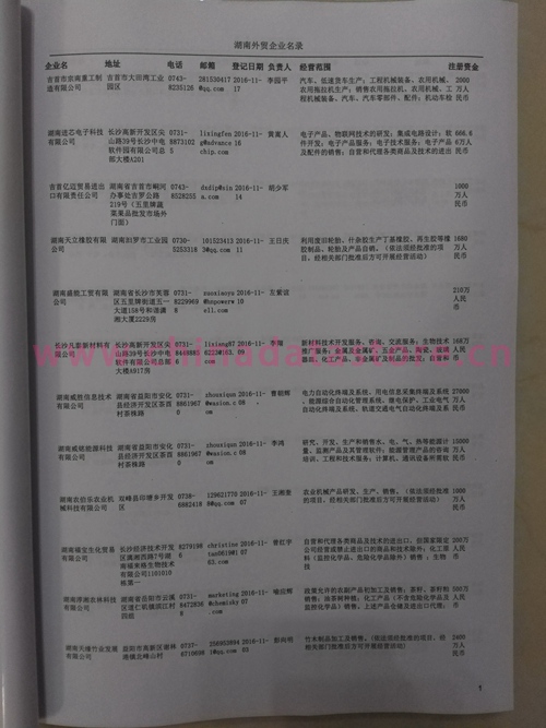 湖南外貿(mào)企業(yè)黃頁(yè)包括:外貿(mào)企業(yè)名稱、地址、電話、傳真、郵箱、經(jīng)營(yíng)范圍、注冊(cè)資金等信息。