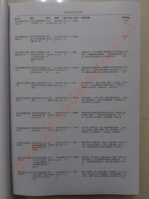 湖北外貿(mào)企業(yè)黃頁包括:外貿(mào)企業(yè)名稱、地址、電話、傳真、郵箱、經(jīng)營范圍、注冊資金等信息。