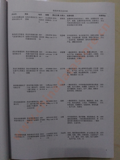 陜西外貿(mào)企業(yè)黃頁(yè)包括:外貿(mào)企業(yè)名稱、地址、電話、傳真、郵箱、經(jīng)營(yíng)范圍、注冊(cè)資金等信息。